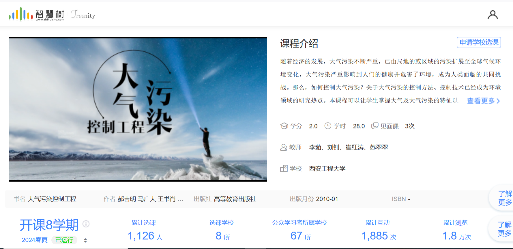 《大气污染控制工程》是环境工程专业的一门专业核心课,系统地阐述了大气污染的基本理论、各种控制方法的过程分析及典型控制设备的工艺设计计算。课程自1985年开设,经过四十多年的建设与创新,构建基于全过程控制理念的大气污染控制教学内容体系,与时俱进、传承发展,形成鲜明特色。该课程2019年被评为校级精品资源共享课程,在团队成员刘钊、崔红涛、苏翠翠的共同努力下,在智慧树平台建成线上慕课。