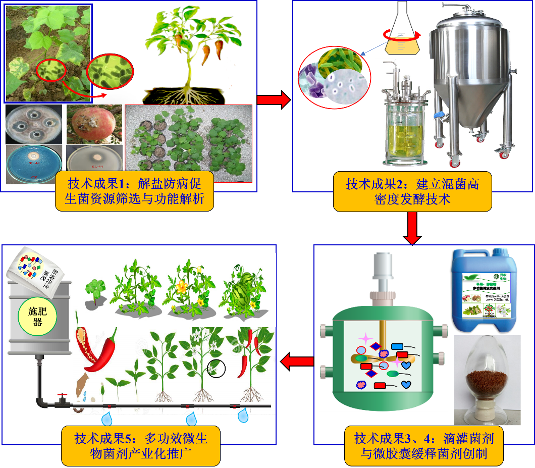 武占省教授牵头,由西安工程大学、清华大学、石河子大学、咸阳润源生物科技有限公司、西安市农业技术推广中心等单位组成的团队武占省、何艳慧、李春、刘啸尘等人,历经近20年的产学研合作进行基础研究、技术攻关和应用推广,完成的“多功效微生物菌剂研发与推广应用”成果,荣获2023年中国产学研合作创新与促进奖“产学研合作创新成果奖”二等奖。该成果创新性从西北地区获得500余株具有自主知识产权的解盐防病促生功能菌株,完成了10余株优势代表菌株的解盐、防病促生机制解析和全基因组测序与基因功能结构解析;建立了3个协同增效混菌组合和混菌高密度发酵技术,获得有效活菌数为1000亿CFU/ml,活菌数超过农业生物菌剂国家标准的500倍;开发了系列多功效滴灌与缓释微生物菌剂产品和创制技术,获批国家微生物菌剂产品登记证3个,授权国家专利11件;产品和技术已转化到咸阳润源生物科技有限公司等多家单位,在苹果、猕猴桃、辣椒、番茄、黄瓜、西瓜等作物进行推广应用,具有显著经济、社会和生态效益。