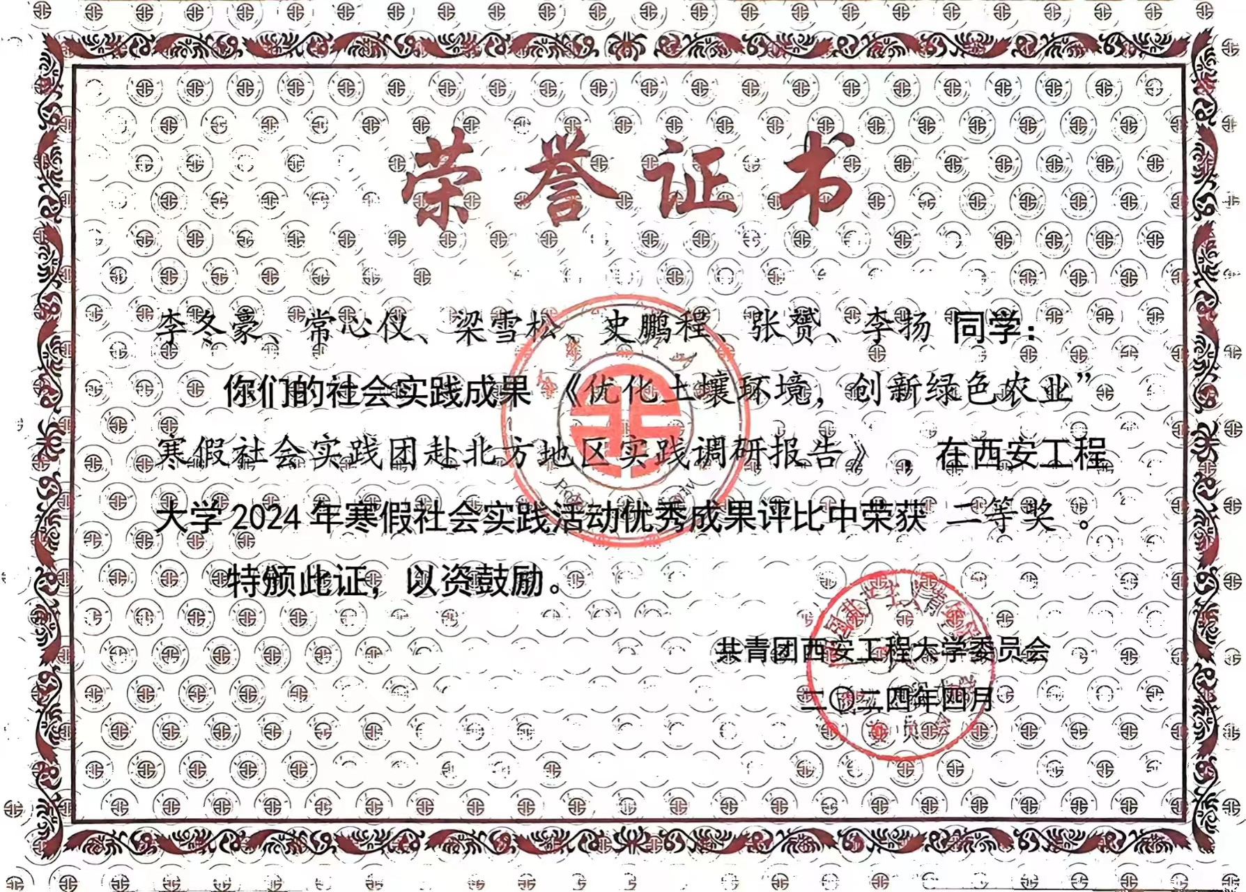 “优化土壤环境,创新绿色农业”社会实践团队在众多参赛队伍中脱颖而出,荣获优秀服务队和优秀成果。“优化土壤环境,创新绿色农业”团队由我学院李冬豪同学带队,队员有常心仪、梁雪松、史鹏程,张赟同学,其中,常心仪和张赟同学荣获“先进个人”的称号。团队指导老师何艳慧老师。