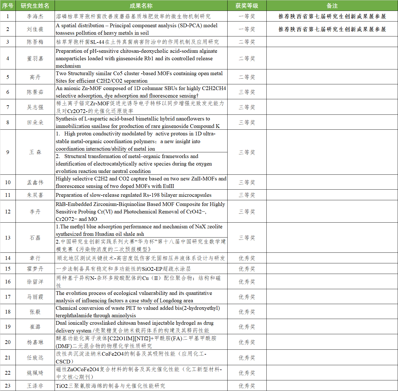 获得一等奖作品2项(推荐参加陕西省第七届研究生创新成果展)、二等奖3项、三等奖8项、优秀奖7项,具体作品形式及名称如下: