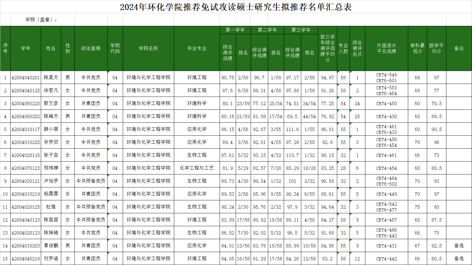 2024年推荐优秀应届本科毕业生免试攻读研究生工作实施方案》。经个人申请、资格审查、推荐领导小组评定,拟推荐陈昊天等13人获免试攻读研究生资格,备选2人,如出现已取得推免资格学生放弃推免等情况,则由备选名单中依次进行递补。现将推荐结果及个人成绩、排名等信息予以公示。(详见附表)