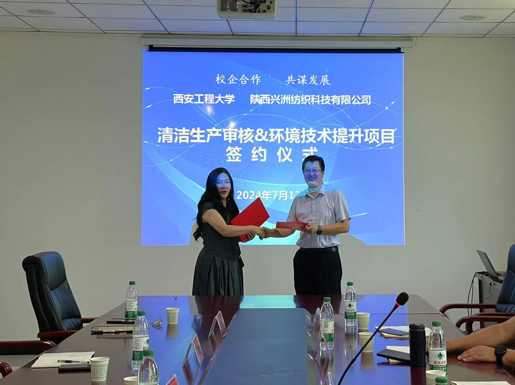 院长武占省与陕西兴洲纺织科技有限公司总经理杨轩分别代表双方签署《西安工程大学与陕西兴洲纺织科技有限公司“清洁生产审核&环境技术提升”项目合同》。