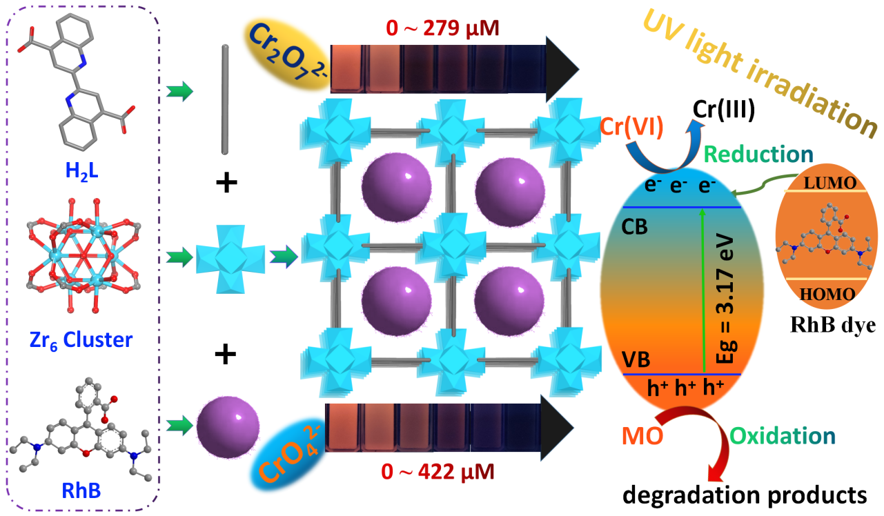 近日,学院材料化工团队李庆副教授课题组针对在水环境化学中发挥重要作用的Zr-MOFs作为光化学探针和光催化剂时,其灵敏度、选择性和光敏性方面存在的技术瓶颈,开展关键科学、技术问题研究并取得新进展。相关研究成果以“RhB-Embedded Zirconium–Biquinoline-Based MOF Composite for Highly Sensitive Probing Cr(VI) and Photochemical Removal of CrO42-, Cr2O72-, and MO”为题发表于无机化学领域国际顶级期刊《Inorganic Chemistry》上(Inorg. Chem., 2022, 61, 15213–15224.中科院一区, IF = 5.436, Top期刊)。