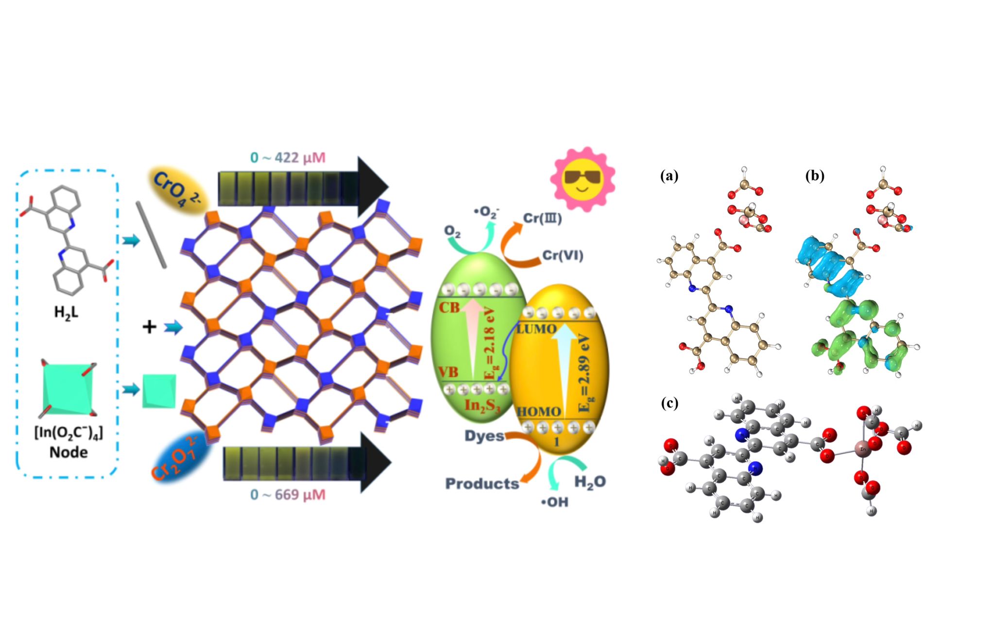 在国家自然科学基金委员会、陕西省科技厅等项目资助下,课题组取得了积极研究进展(Inorg. Chem.,2024, 66, 1816.中科院一区,Top期刊,ESI高被引)。所设计新型In-MOF具有阴离子框架及光致发光效应,通道式空腔内修饰以喹啉N和羧基O原子。能够对Cr(VI)和Cu2+离进行荧光淬灭传感,具有可靠的选择性和抗干扰性能,高检测灵敏度及低检出限。通过DFT和TD-DFT对基态和激发态进行建模,确定了LLCT的发光机制。负电性框架能够快速及选择性捕获阳离子染料;在紫外光下对活性染料具有高效光催化降解能力。通过进一步构建S型异质结In2S3/In-MOF,在可见光下实现了印染加工用Cr(VI)及活性染料的高效光化学转换及清除。该研究成果及其新发现为设计基于MOFs的新型多功能水处理药剂,以解决一些棘手的环境问题,提供了可借鉴的实践途径与理论参考。本成果第一作者为925足球网