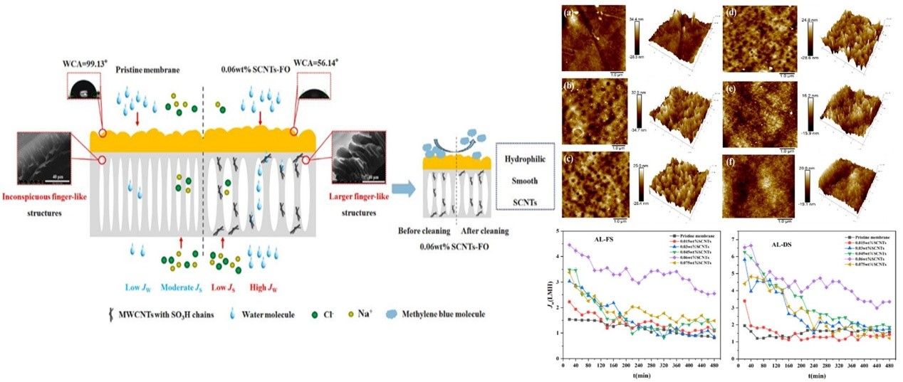 为了进一步提高所制备膜的抗污染能力,将磺化碳纳米管同时作用于正渗透膜活性层与支撑层,成功制备出了一种新型正渗透膜,并在《应用化工》期刊发表题为“磺化碳纳米管改性聚酰胺类正渗透膜的制备及表征”的研究论文,2022级环境工程专业研究生朱仲翊为论文第一作者,导师崔红涛为通讯作者。随后对所制备正渗透膜的性能进行了渗透性、选择性与抗污染性评估,发现膜同时具备优异的渗透性能及抗污染性能,并在国际会议The International Conference on Green Energy and Environmental Systems (GEES 2025)发表研究论文“Performance evaluation on the forward osmosis membrane modified by sulfonated carbon nanotubes”。2022级环境工程专业研究生朱仲翊为论文第一作者,导师崔红涛为通讯作者。