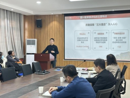 随后,评建办秘书、教务处副处长胡新煜对新一轮审核评估的主要特点进行了全面的解读,深入浅出地讲解了审核评估的7个一级指标、27个二级指标。他重点强调了学院在迎评促建工作中的工作清单,并针对培养方案、课堂教学、试卷和毕业设计及访谈环节做了细致入微的指导。