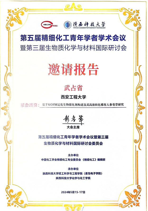 武占省教授受邀参会并担任分会场主持人,在会议中受邀作了题为“基于MOF固定化生物催化剂构建及其高效转化稀有人参皂苷研究”的学术报告。会后,武占省教授围绕如何开发高效生物催化剂与参会的专家及代表进行了深入的交流与讨论。