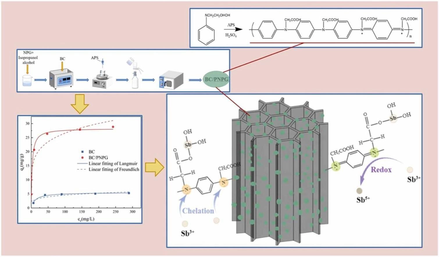 随着化纤工业快速发展,含锑(Sb)催化剂的广泛使用导致Sb污染物在印染前处理工艺(退浆和碱减量)流程中大量析出,随废水排放进入水环境。Sb作为一种具有显著生物毒性和潜在致癌性的重金属,其在水体中的累积不仅严重威胁水环境安全和生态系统健康,更对我国纺织印染行业的绿色可持续发展构成严峻挑战。现有传统污水处理工艺对Sb的去除效率低,难以满足日益严格的排放标准。因此,开发高效、低能耗、环境友好的的深度除锑技术,并推动其工程化应用,已成为保障水环境安全、建设“美丽中国”的迫切需求。生物炭吸附法虽具有操作简便、资源节约等优势,但原始材料吸附性能不足,严重制约其在印染废水锑污染治理中的实际效能。