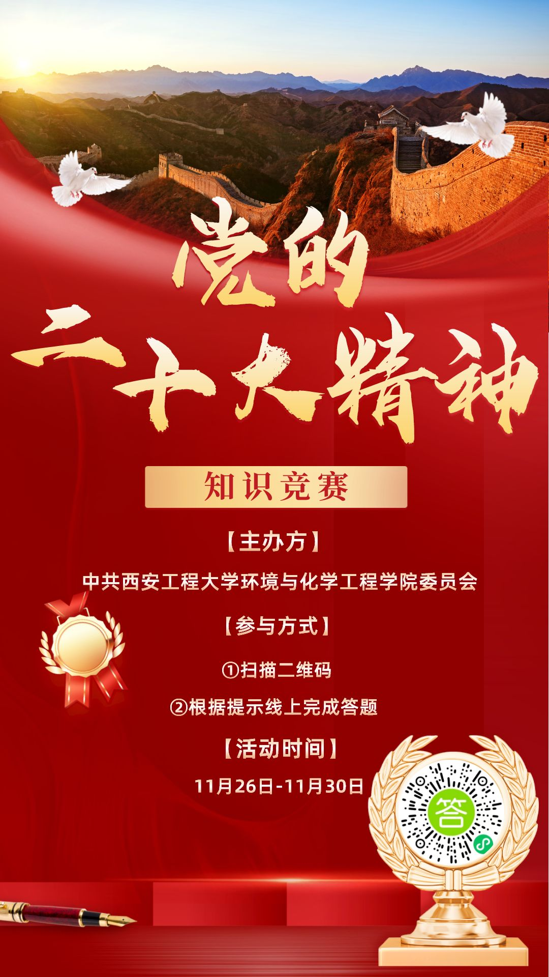 于2022年11月26日至2022年11月30日举办“喜迎二十大、奋进新时代”党建知识竞赛,各党支部积极主动开展学习党的二十大报告核心要义和精神内涵,大赛主要通过线上答题方式举行,累计有70余名教工党员参加。