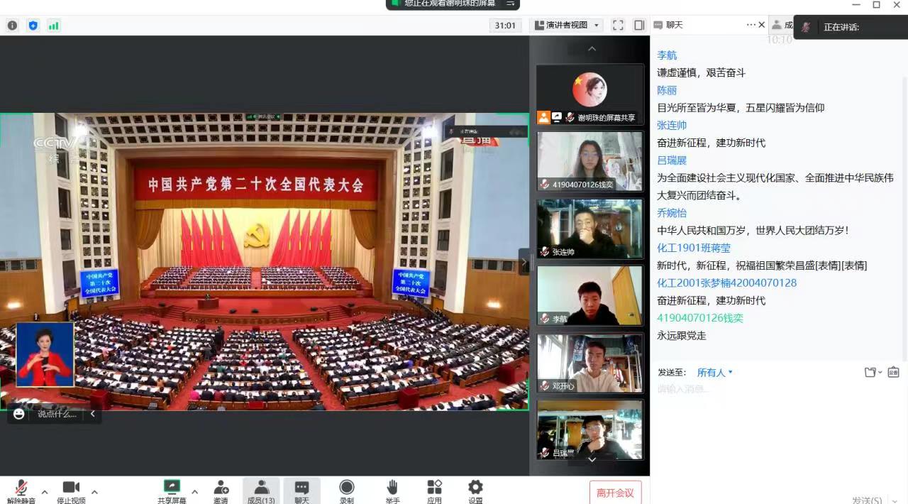 化工学科研究生党支部党员董羽嘉表示:我们青年人作为党和国家事业的“接班人”,要坚定信仰、坚守初心、奋力拼搏。始终保持永不懈怠的精神状态和一往无前的奋斗姿态,矢志不渝的沿着中国特色社会主义道路奋勇前进。青春就是敢于“做梦”,敢于“冒险”,青年干部当胸怀“鹰击长空”之志,将个人理想融入党和国家的事业中,勇敢跳出舒适圈,为中华民族复兴再“增一力”。