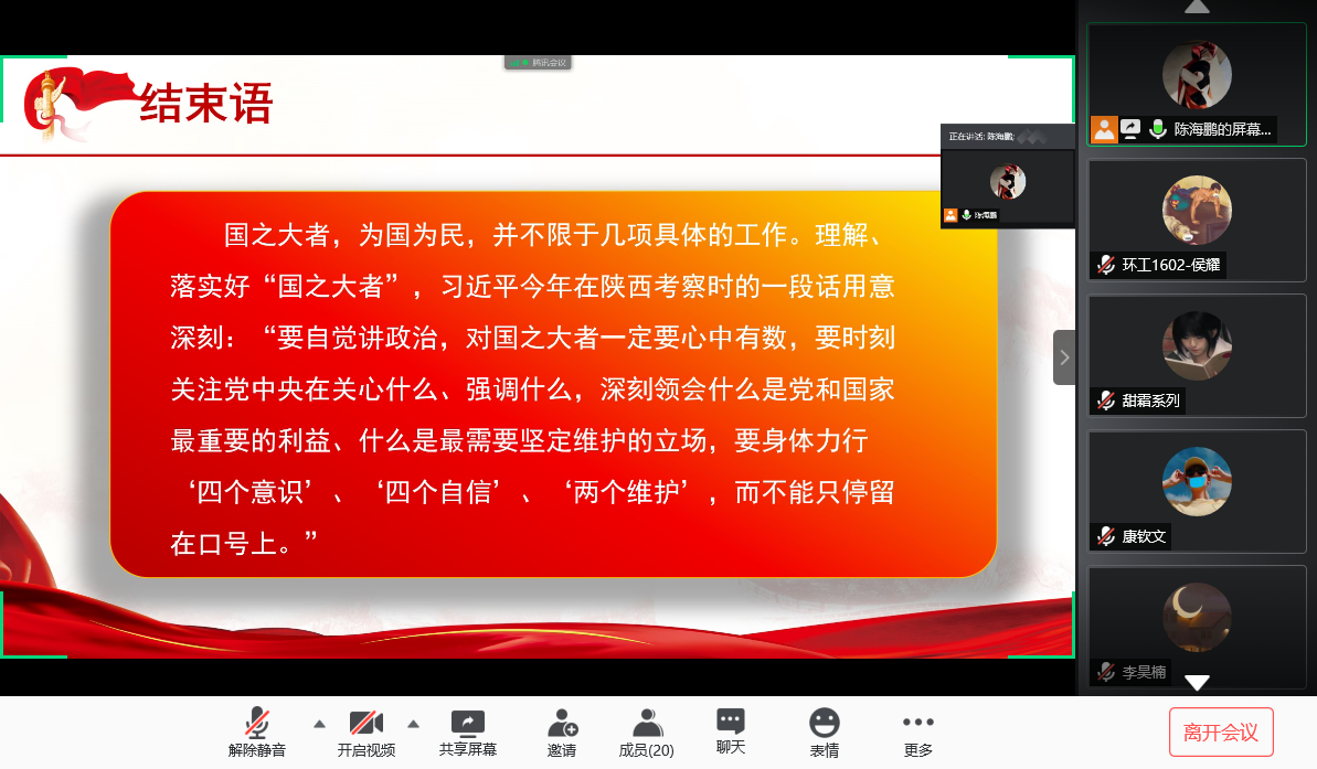通过学习讲话精神,党员们领会了“要自觉讲政治,对国之大者一定要心中有数,要时刻关注党中央在关心什么、强调什么,深刻领会什么是党和国家最重要的利益、什么是最需要坚定维护的立场,要身体力行‘四个意识’、‘四个自信’、‘两个维护’,而不能只停留在口号上”的深刻含义。邵瑞华老师最后给支部学生党员提出要求:身为一名大学生共产党员,现在更应该把讲政治放在首位,加强自己的专业素养,为祖国的生态环境保护事业贡献自己的青春和力量,为疫情防控和复工复产贡献自己的一份力量。(撰稿:邵瑞华 审稿:李建学)