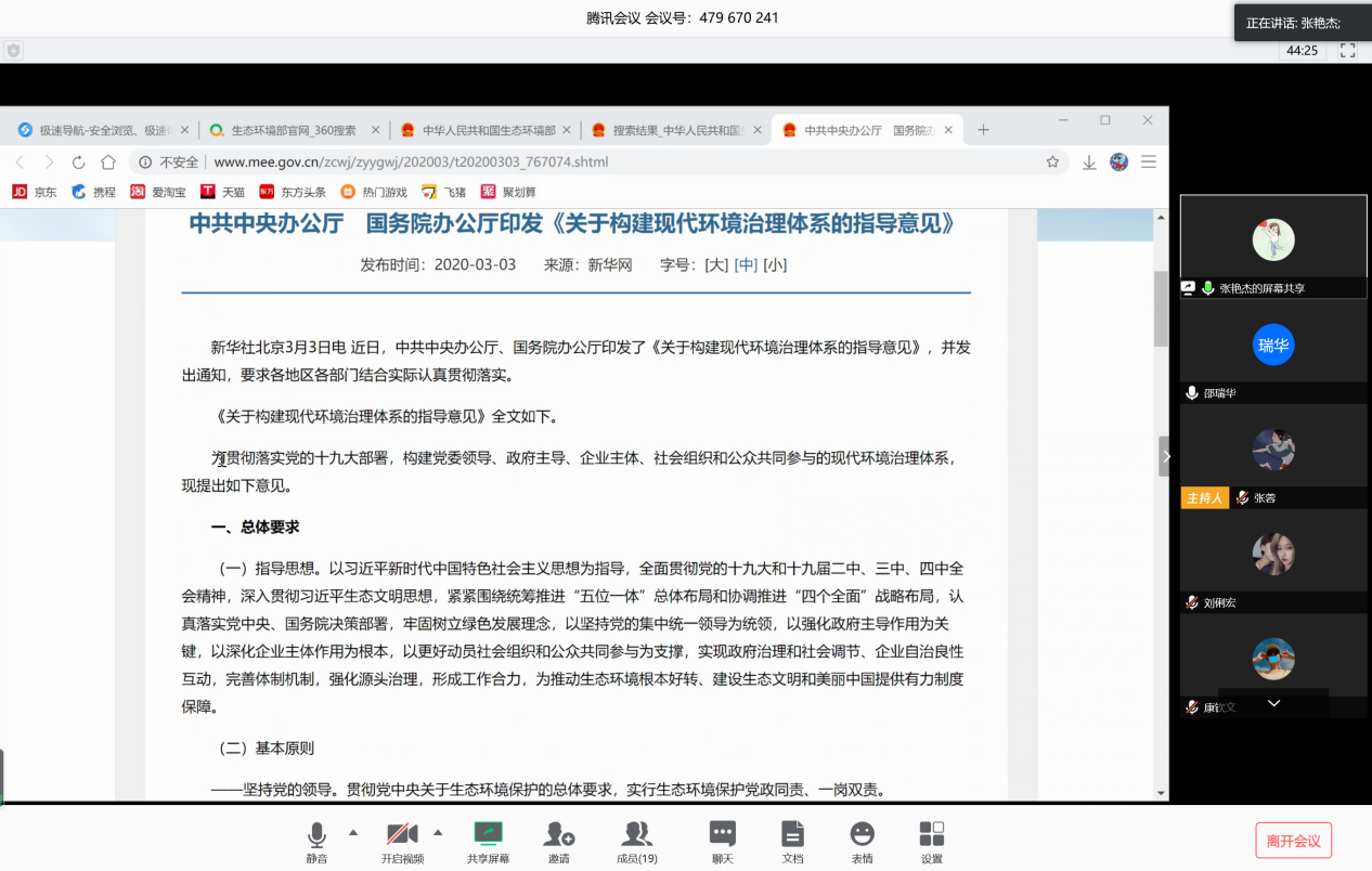 会议分为三个部分,第一部分是学习十九届四中全会基本概况;第二部分观看“如何准确领会十九届四中全会精神”视频;第三部分结合专业特点学习了近日由中共中央办公厅、国务院办公厅印发的《关于构建现代环境治理体系的指导意见》。