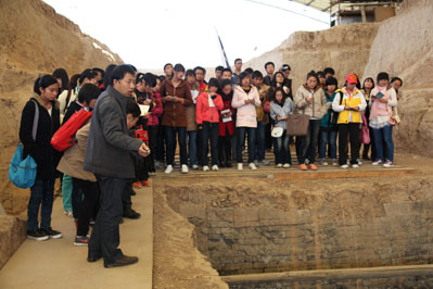 早晨7:30,活动在“我们是半坡志愿者,我们即将踏上旅程”的呐喊声中拉开帷幕。素质拓展培训在西安博物院举行,在工作人员的带领下参观了西安博物院,之后在西安博物院举行了志愿服务交流会座谈会,双方就讲解工作中的各项环节进行了交流。下午2点志愿者一行46人乘车来到凤栖原考古工地,考古队丁岩老师热情地向大家介绍了考古工地,并带领志愿者观看了考古工地,活动最后,考古队为志愿者们播放了考古工作开展PPT视频,最后就相关古文化历史知识进行了互动交流。