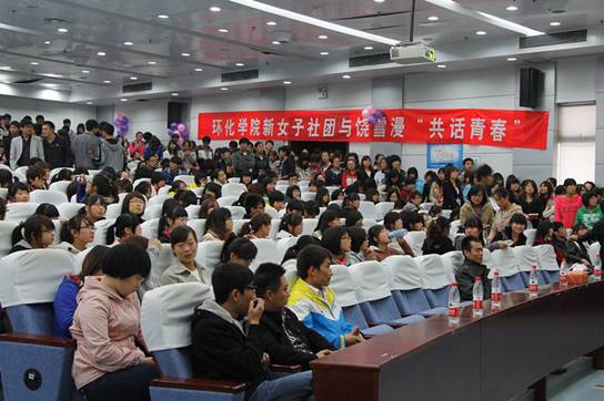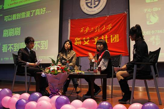 首先由新女子社团指导老师林定武对两位作家的到来表示欢迎,对在场的同学多年来对新女子社团的支持表示衷心的感谢。下来开始了访谈,主持人分别介绍了两位作家的基本情况,并提问了一些同学们关心的学习、生活、情感方面问题,两位美女作家诙谐,睿智的解答博得全场阵阵喝彩。在场的同学也纷纷提出自己的问题,两位作家耐心,认真地和同学们从不同的角度交流沟通,让同学们感受到了两位作家各自独特的思维,感情,和对事物深度的分析理解,现场气氛异常热烈。饶雪漫建议当代大学生应该多读书,读各种作家的书。本次访谈的最大亮点就是开通了微博互动,同学们可以将自己想说的话通过微博发表在大屏幕上。最后开始了大家渴望的签名,同学们拿着饶雪漫和西岭雪的作品井然有序的排队等候签名。
