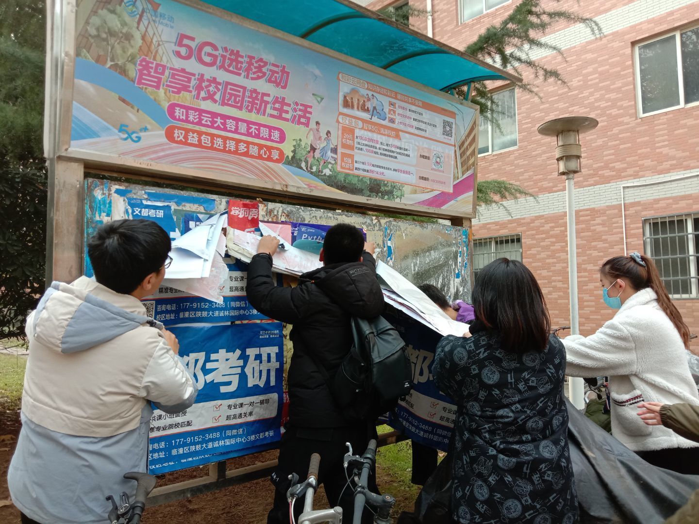 青分队带领19、20级志愿者进行义务清理宣传栏活动。