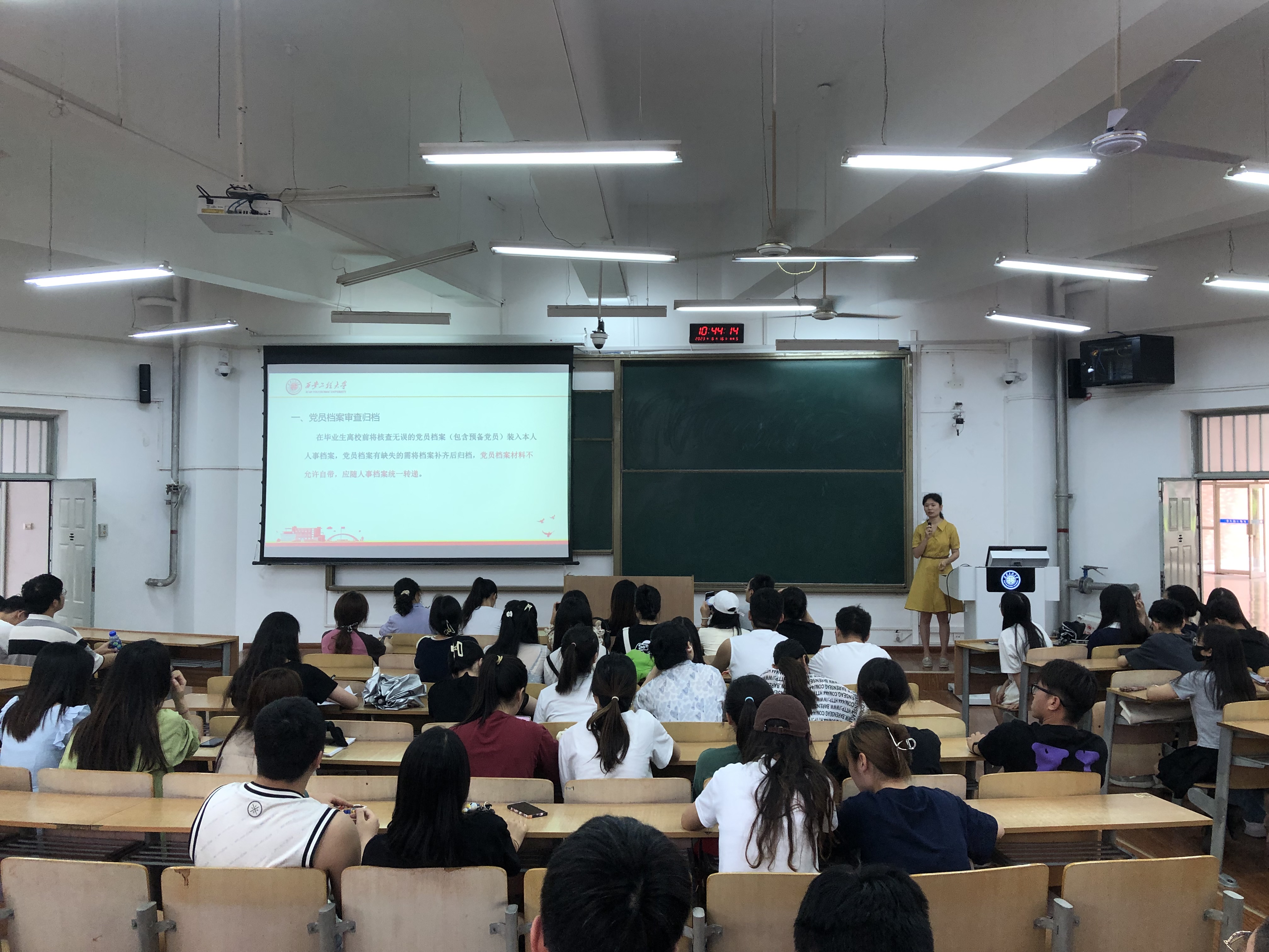 会上,辅导员刘婧从党员档案审查、落实组织关系去向、开据组织关系介绍信、核查毕业生组织关系落实情况四个方面详细介绍了党组织关系转接的系列程序及注意事项,并多次强调党组织关系转接的及时性与重要性。在接收单位方面,根据是否落实工作单位两种介绍了不同的接收方式;针对转入省内和省外不同情况,做了具体的注意事项和转接方式的说明。此外,她对毕业生党员提出殷切希望,嘱咐毕业生党员进入社会踏上工作岗位后,要将理想信念具象化,融入到实实在在的工作中,充分发挥党员的先锋模范作用。