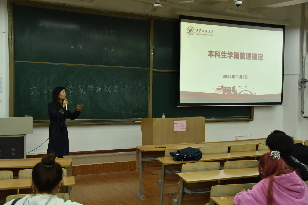 于11月10日下午在临潼校区B133教室召开2020级本科生学籍管理规定宣讲会。副院长常薇、教务处耿倩、2020级辅导员张易泽及2020级全体新生参与本次会议。