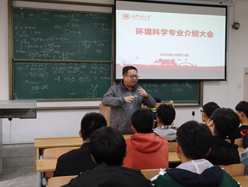 会议开始,谭志海从专业发展历程、教学理念和专业发展方向三方面介绍了环境科学专业。紧接着,王毅博列举出了环境科学专业多年来取得的一项项成就,并且在向全体新生传授了自身经验后,表达了对全体新生的期许。最后,王毅博鼓励同学们学好基础学科为今后专业课的学习奠定基础。