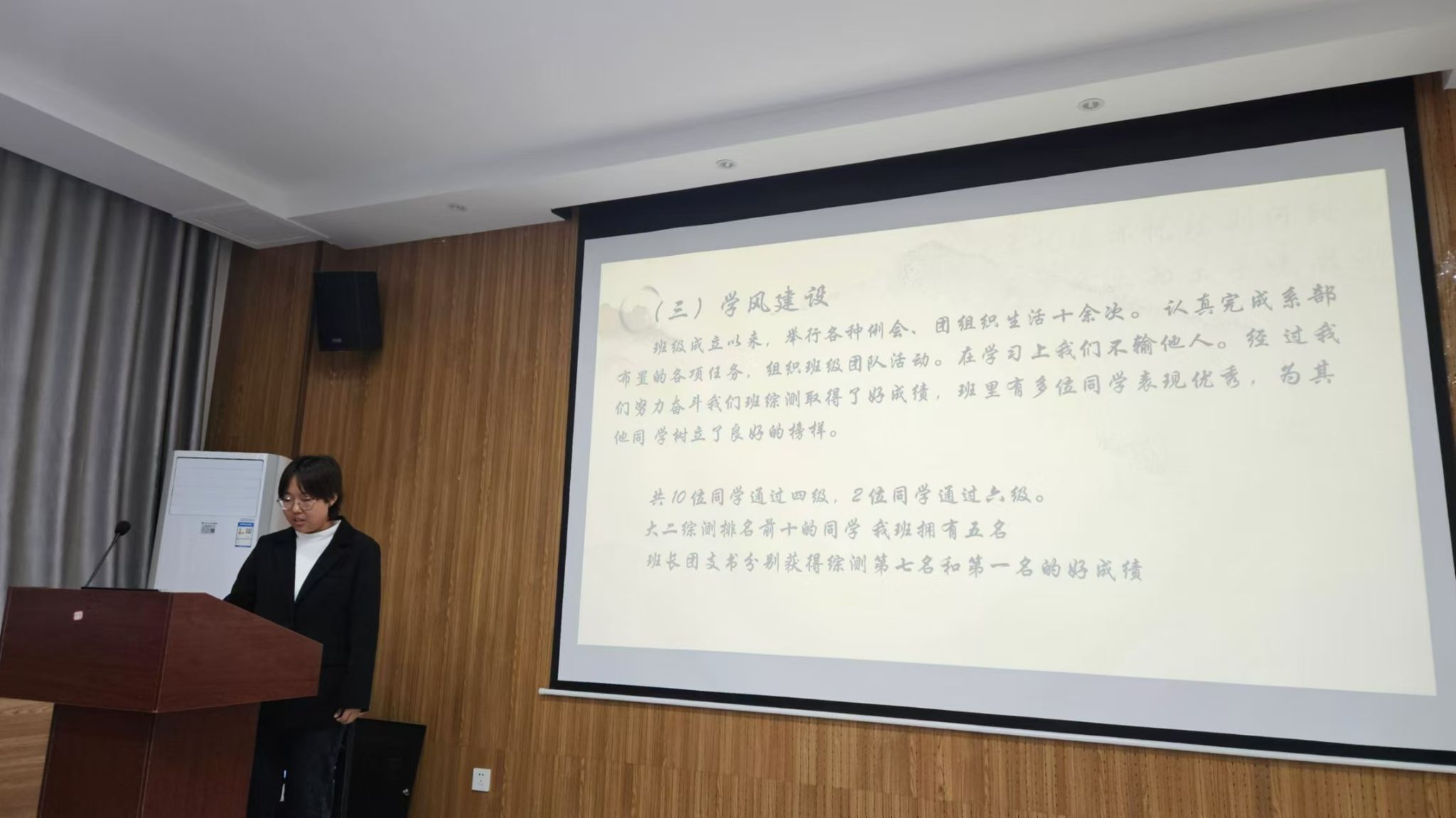 今年共有28个班级申报“优良学风示范班”,经年级推荐,学院审核,从中择优推选了15个班级申报“优良学风示范班”。 各班通过精美PPT展示和讲解,结合本班特点,逐一展示了各自班级学风建设举措和成果,展示了各班同学团结友爱,积极向上精神风貌,现场氛围热烈。