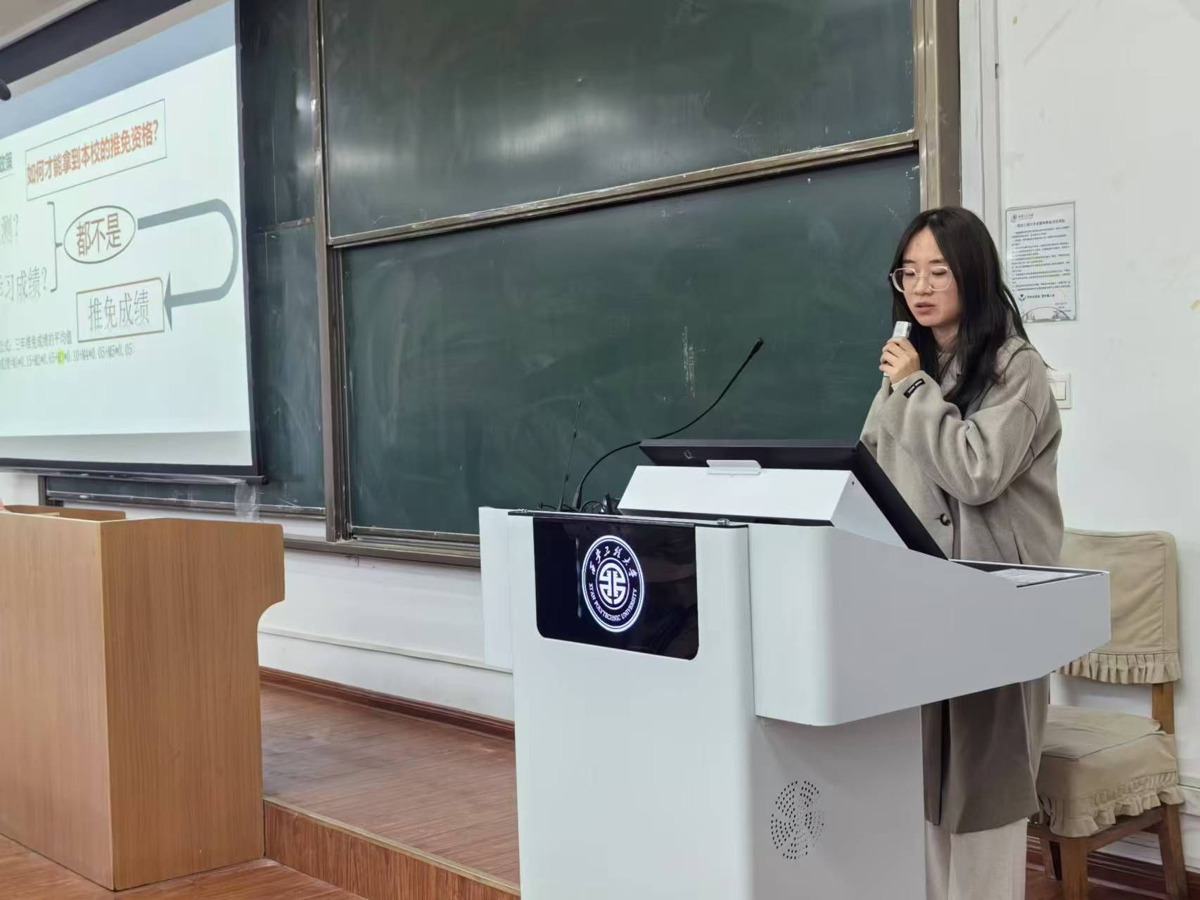 赵家瑞同学与大家分享了保研的心得,她指出要从大一制定目标,在确保符合保研条件的情况下,认真对待自己的每一个课程,努力提升自己的成绩排名,积极参加学校学院的活动,增强自身的核心竞争力。