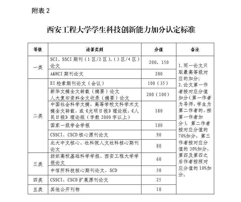⑥ 发表学术论文,根据期刊等级和类别、作者排序加分(参照附表2,论文必须以西安工程大学为第一完成单位且已正式发表或可检索);出版学术著作、译著等,独立出版或担任主编加10分、参编3万字以上加5分、参编2万字以上加4分,参编1万字以上加2分,参编1万字以下加1分;