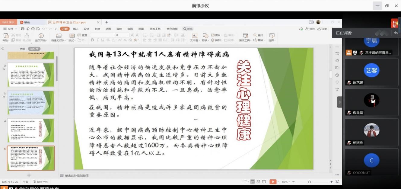 讲座初始,主讲人庞坤宇首先就此次疫情表达了一些个人看法“因为疫情,我们虽然无法在教室学习,犹如困兽被迫在家学习,但这并不能阻挡我们对学习和生活的热情"。之后各个宿舍长通过视频互相交流,分享疫情在家期间班级同学遇到的各种心理问题,并且通过讨论如何应对与解决这些问题。最后庞坤宇表示面对疫情,我们不缺乏抗争的勇气和力量,每个人都期待再次相聚的日子。