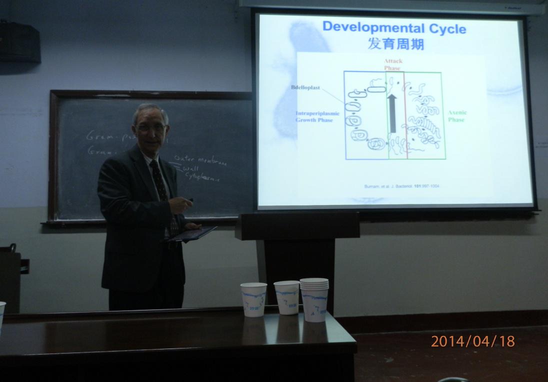 在报告中,John J. Tudor教授详细讲述了对于Bdellovibrio菌最新研究近况和相关成果,与专业老师和现场同学们进行了专业学术上的热烈讨论,结束之余,还与现场同学们进行中美文化差异的互动探讨。