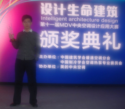 研究生江春阳、徐子龙在第十一届全国MDV中央空调设计应用大赛中荣获学生组“杰出设计奖”,狄育慧教授获得优秀指导教师奖。