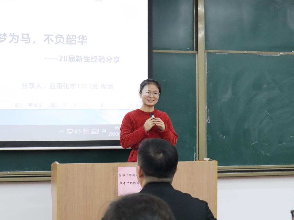 会议伊始,李建学代表学院全体师生对2020级新生的到来表示热烈欢迎,同时,他鼓励同学们要树立远大目标,不断努力进取;锤炼自身品格,“扣好人生的第一粒扣子”。随后,张洛红从学院办学历史、办学条件、学科建设等方面对学院的基本情况进行了简要的介绍,他希望同学们在未来不仅能取得学业上的成功,更能保持执着专注,在磨砺中成就自我。最后,国家奖学金获得者、2017级应用化学1班程潘代表在校学生发言,她分享了自己在大学生活、学习的经历,并鼓励大家要有目标、有决心、不断上进。