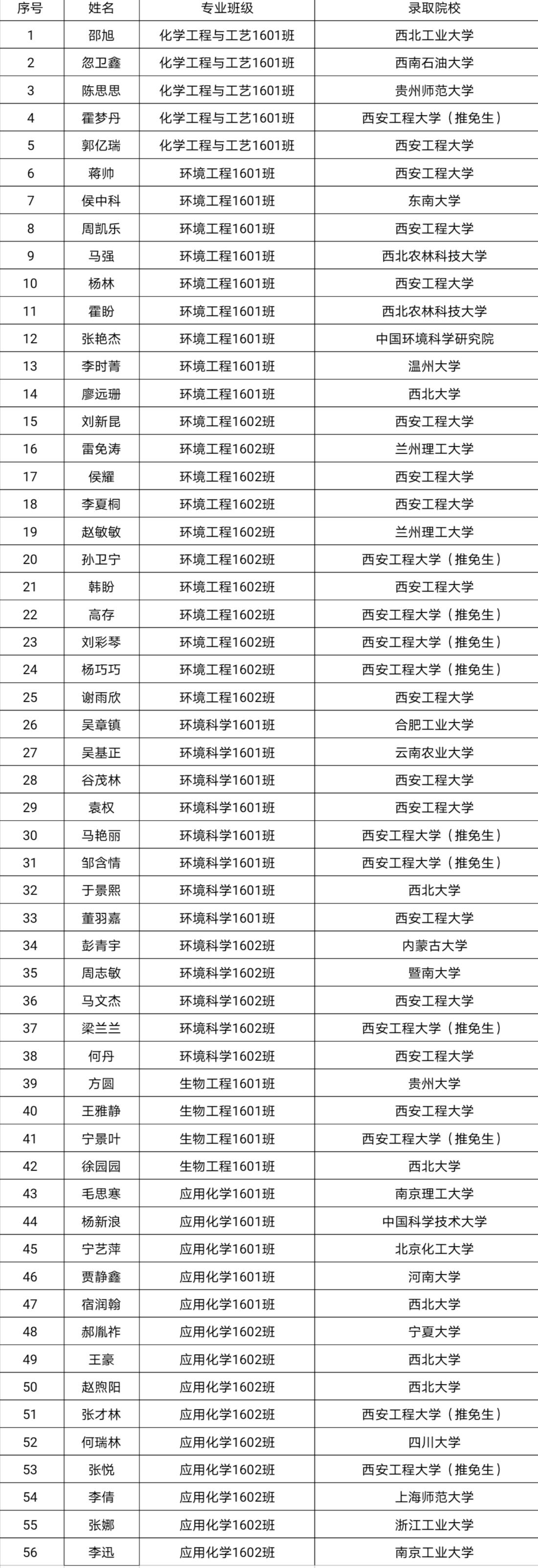 再传考研捷报。今年共有56人考取研究生,考研录取率达24.56%,其中环境工程专业升学20人,录取率32.25%;应用化学专业升学14人,录取率25.45%;环境科学专业升学13人,录取率23.63%;化学工程与工艺专业升学5人,录取率19.23%;生物工程专业升学4人,录取率13.33%。录取院校包括中国科学技术大学、东南大学、四川大学、西北工业大学、中国环境科学研究院、暨南大学、西北大学、西安工程大学等。