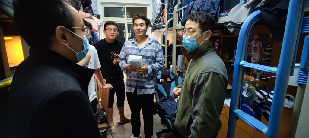 党委书记胡西民和副书记林定武书记走访学生宿舍,为所有研究生发放防疫物资,并与他们展开深入的交流。