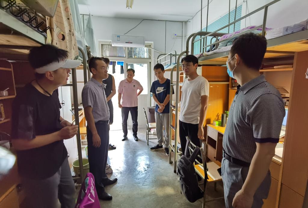新搬迁的2021级男生22间宿舍修缮情况。检查过程中,各位老师细致入微,尽职尽责,将发现的问题及时上报并处理,对涉及搬迁的每间宿舍的桌椅、灯管、床板、门把手、空调等进行逐一的排查与记录。随后,学院领导前往7号研究生公寓看望暑假留校的研究生。2020级化学工程与技术班的罗杰向大家介绍目前留校学生整体情况,张洛红院长询问研究生在校期间的科研进展及生活保障等问题,叮嘱大家要遵守学校疫情防控要求,坚持每日健康监测,做到劳逸结合,为新学期的学习生活做好准备。胡西民书记表示,新生宿舍检查活动,是迎新工作的重要组成部分,他强调各位辅导员务必要加深对学生宿舍的了解,全面保障新生有序到校报到。