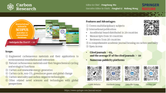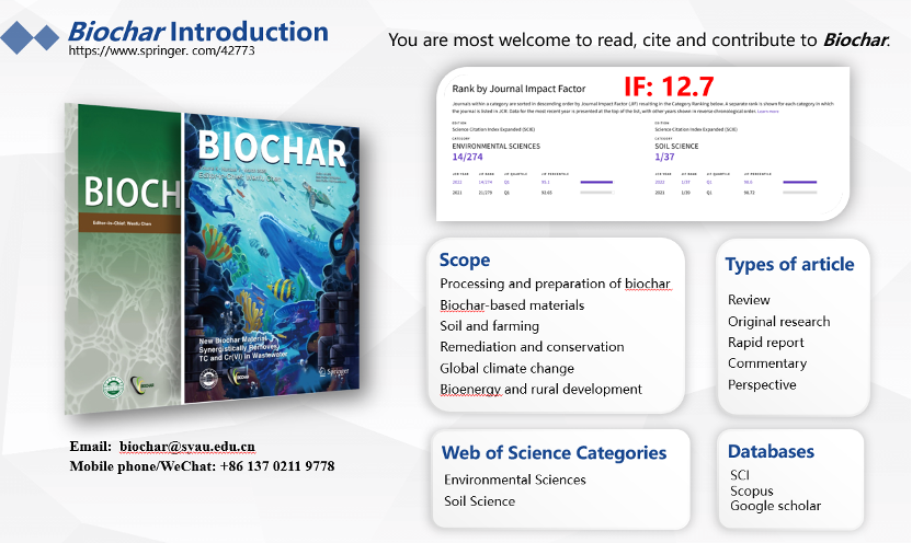 《Biochar》是《Carbon Research》姊妹期刊,是由沈阳农业大学主理并与施普林格·天然团体协作出书的全英文季刊,于2019年3月创刊,是环球第一本生物炭范畴期刊。目前是中国科学院期刊分区一区,影响因子12.7。《Carbon Research》是由广东省科学院生态环境与土壤研究所主办的国际全英文季刊,于2022年6月18日创刊正式登陆Springer Nature集团在线平台,于2022年3月17号正式开放投审稿系统,目前以开放获取模式出版。武占省教授是这两个期刊青年编委,欢迎广大师生投稿、检索阅读。