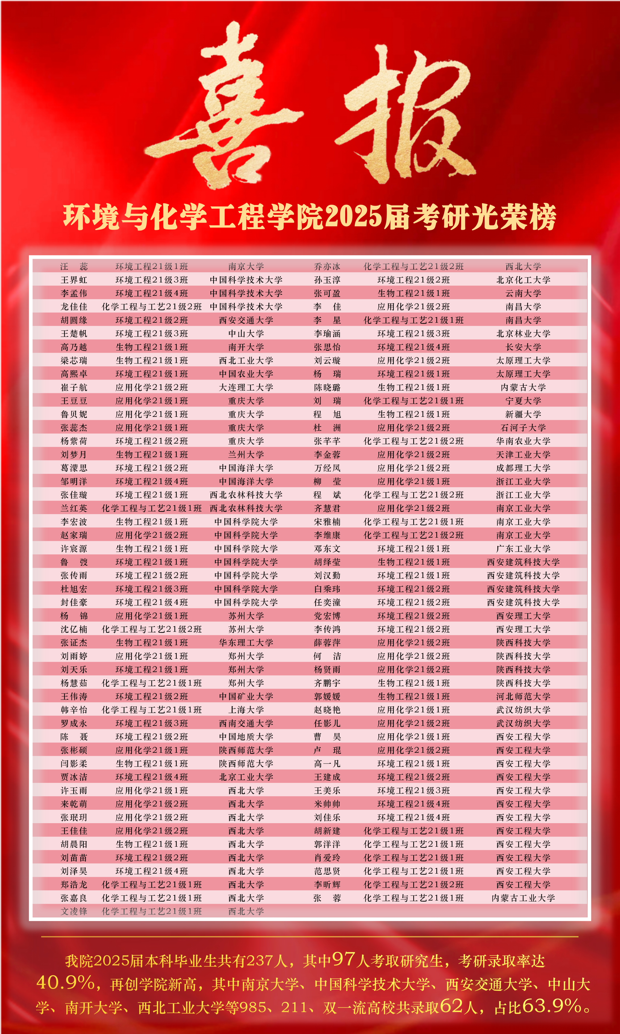 在2025年全国硕士研究生招生考试中,925直播足球 再传捷报。237名本科毕业生中97人成功“上岸”,整体录取率达40.9%,实现自2018年以来的"七连增",创历史新高。其中62名学子被南京大学、中国科学技术大学等双一流高校及科研院所录取,占比达63.9%。化工2101班、环工2102班、应化2102班升学率超过50%,同时涌现出8个升学率超75%的“学霸宿舍”,其中6#B623、8#A314宿舍全员上岸。这些成绩的取得,既是学院人才培养质量的体现,也是学风建设的成果。