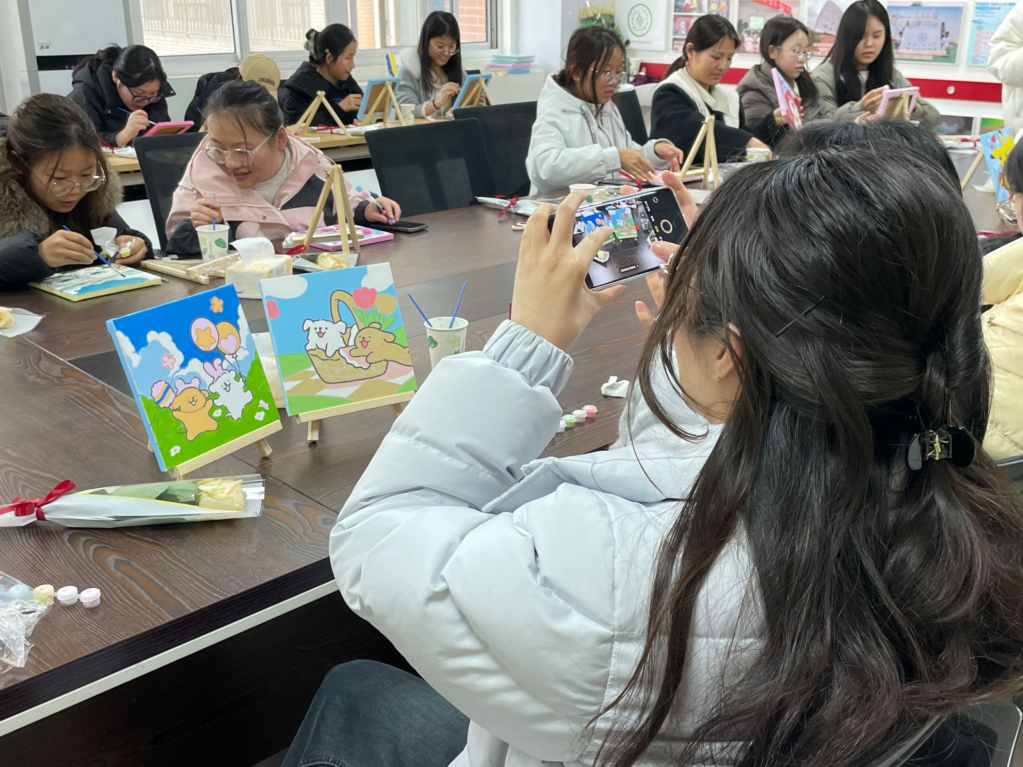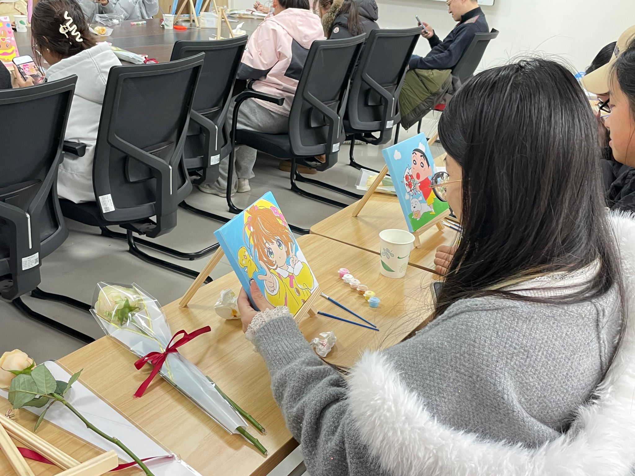 随后,活动进入了温馨而富有仪式感的插花环节。现场准备了玫瑰与精美的包装材料。在任老师的引导下,每位同学亲手将一朵朵象征着爱与美好的玫瑰花细心插入包装纸中,并系上精致的丝带。这一环节不仅让大家体验到了亲手创造美感的乐趣,更在互动中传递了节日的温暖与祝福。