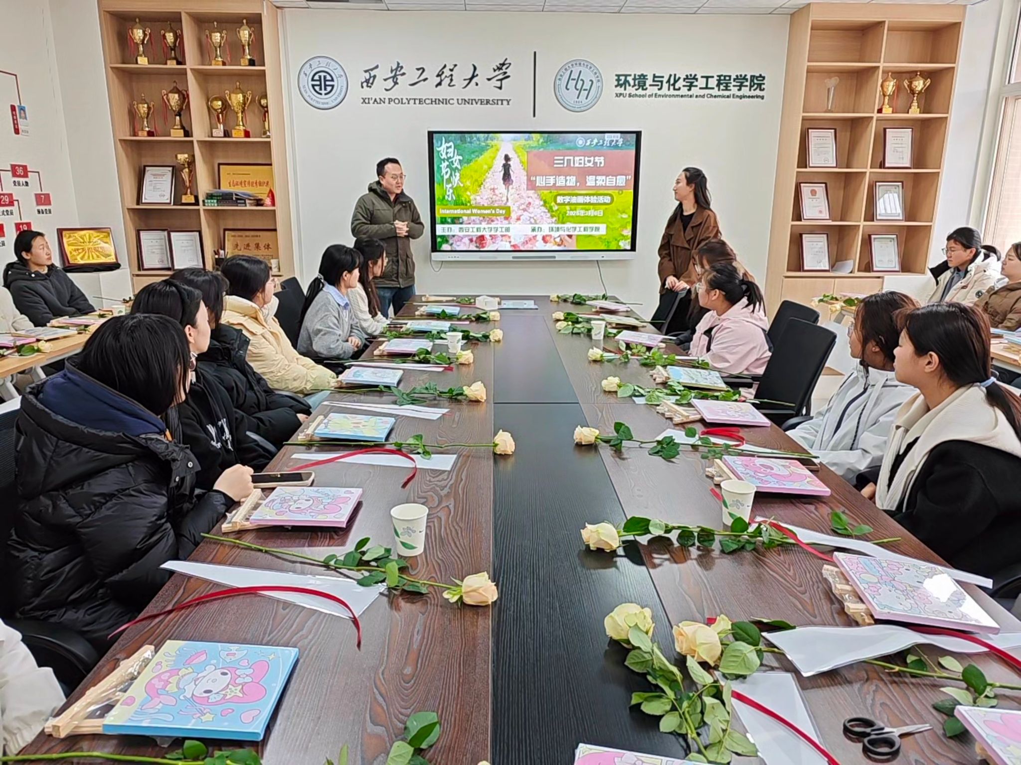 活动伊始,任子瑜老师向在场的全体女生致以节日的诚挚问候和美好祝福,并阐释了举办此次活动的初衷。她指出,在快节奏的学习生活中,通过艺术创作进行自我表达与情绪疏导,是促进心理健康、实现温柔自愈的有效途径。屈展老师结合专业视角进一步指出,艺术创作的过程也是与内心对话的过程,能够帮助大家在色彩与线条中更好地认识自己、找到自我。两位老师共同鼓励同学们在动手创造中暂时放下压力,专注于当下的宁静与美好,感受内心的平和与力量。