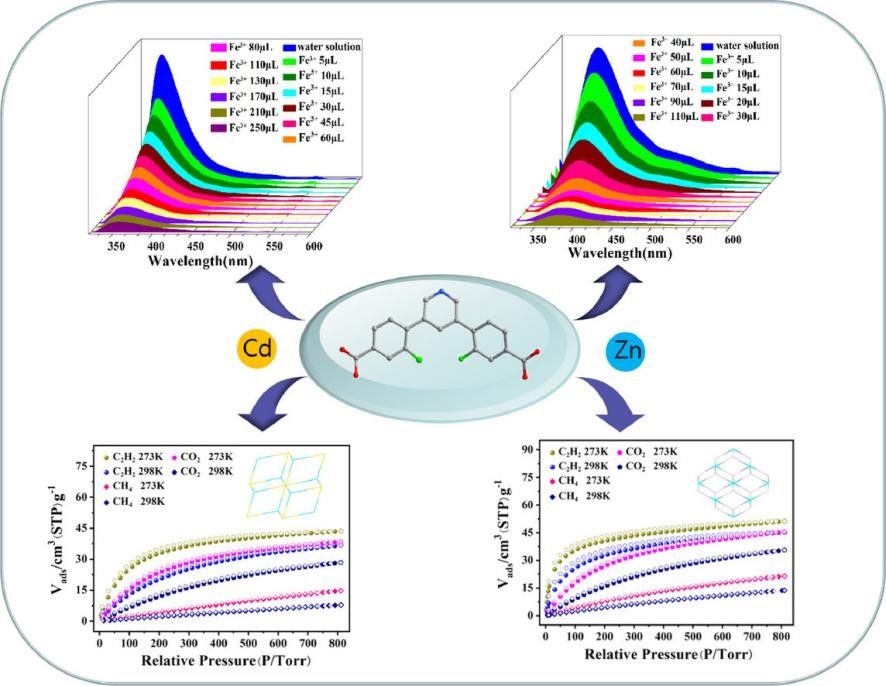 论文二:采用氟化吡啶配体L1,通过溶剂热法合成了两种新型金属有机框架:二维结构的Cd-MOF(MOF 1)和三维结构的Zn-MOF(MOF 2)。气体吸附研究表明,两者均具有良好的气体吸附性能,其中MOF 2对乙炔/甲烷具有高选择性。此外,两种MOF均可选择性检测水中的Fe3+离子(图2)。