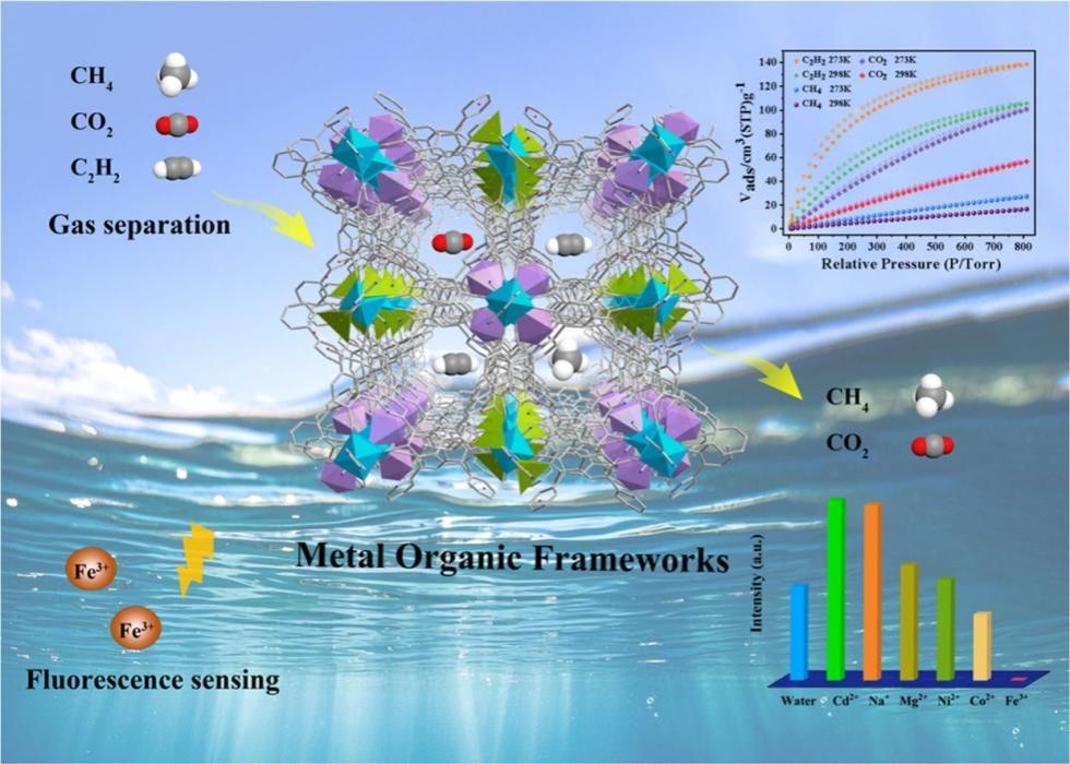 论文三:本研究通过不对称五羧酸配体与氨基三唑辅助配体,成功构筑了新型锌基MOF(JDT-Zn)。该材料对乙炔具有高吸附容量(105.6 cm3·g-1),并能选择性分离C2H2/CH4和C2H2/CO2混合气体。DFT计算揭示了其吸附分离的微观机制。在此基础上,通过掺杂稀土元素Eu和Tb制备了JDT-Eu-Zn和JDT-Tb-Zn,二者可作为荧光传感器,在水溶液中选择性识别Fe3+离子。