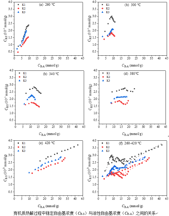 论文一:该工作以龙口三种不同密度级的油页岩有机质为实验对象,计算了有机质中8种主要共价键的浓度,归纳了不同共价键浓度的变化规律,以探究不同密度油页岩的演化特征。同时,采用DHA作为供氢溶剂,间接测定了有机质在260-420 ℃热解过程中活性自由基的生成量,分析了生成的活性自由基类型及其与结构的关系,并测定了热解产物中稳定自由基的生成量,从而揭示了活性自由基耦合生成稳定自由基的规律。