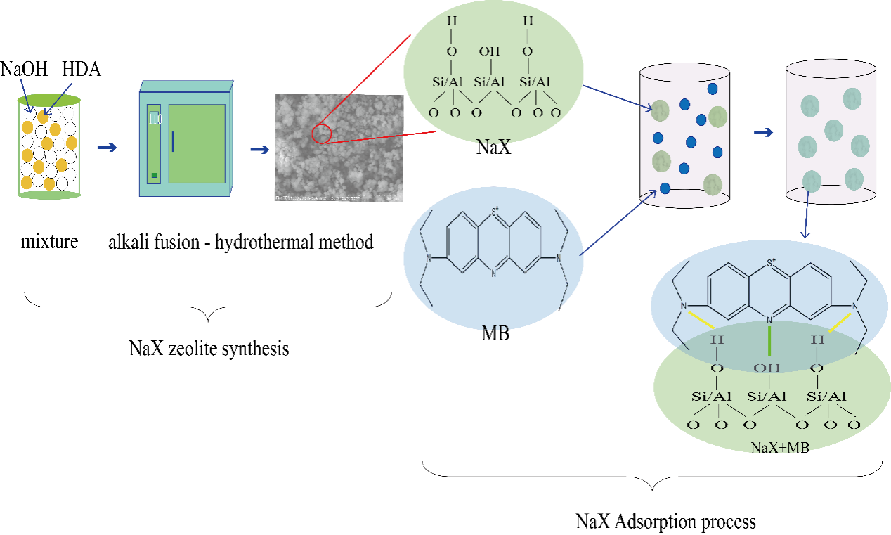 论文三:该工作以桦甸油页岩灰为原料,采用碱熔水热合成法成功制备了NaX型分子筛,并探究了其对亚甲基蓝的吸附效果及其吸附机理。结果表明该分子筛对亚甲基蓝具有良好的去除效果,并且可多次重复再生使用。