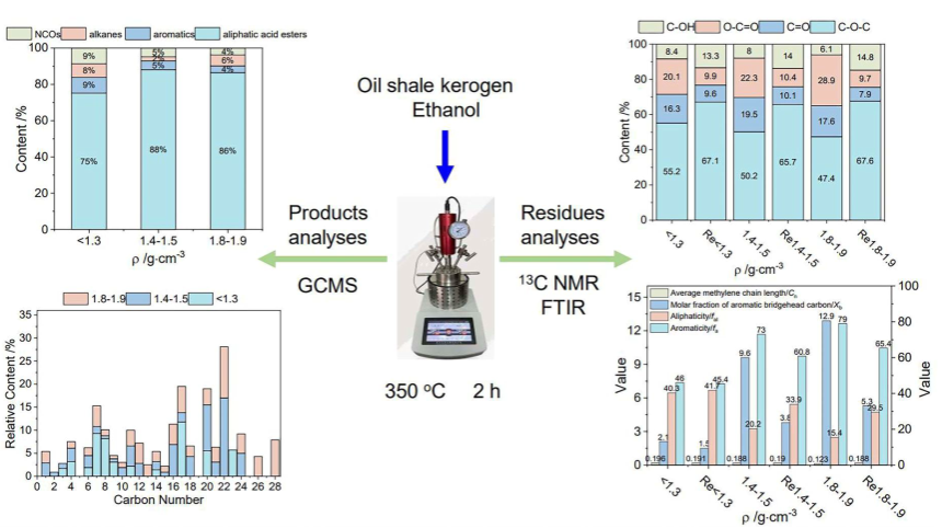 论文二:该工作以龙口三种不同密度级的油页岩有机质为实验对象,采用醇解手段将其降解,明确了分析液相产物和固体残渣的物质结构和组成,阐明了油页岩热解过程中弱共价键的断裂规律。