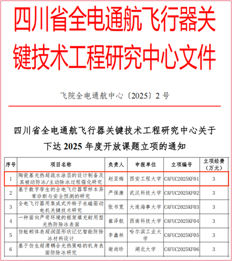 赵亚梅教授牵头申报的开放基金项目《陶瓷基光热超疏水涂层的设计制备及其被动防冰/主动除冰过程强化研究》成功获批四川省全电通航飞行器关键技术工程研究中心开放课题立项。这是我校首次获批该中心开放课题,也是925足球网