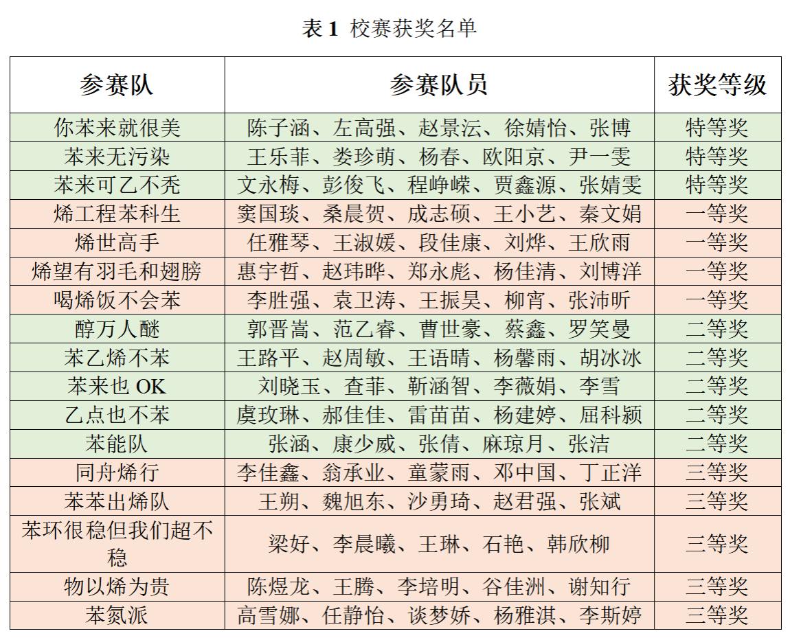 承办的西安工程大学第七届“笃行杯”化工设计竞赛式在我校成功举行。本届校赛共有17支参赛队伍,再创新高,本次校赛,旨在为同学们搭建展示自我、交流学习的舞台,检查大家的工作进度和内容,基于此来选拔优秀的队伍冲击更高层级的比赛。经过同学们不懈努力,17支参赛队均按时提交了作品,经过各位指导老师评审,共有3支参赛队荣获校级特等奖;4支参赛队荣获校级一等奖;5支参赛队荣获校级二等奖;5支参赛队荣获校级三等奖(具体获奖名单见表1,排名不分先后)。获得特等、一等和二等奖的参赛队将继续打磨作品,继续参加化工设计竞赛省赛和西北赛区赛,预祝他们取得好成绩!