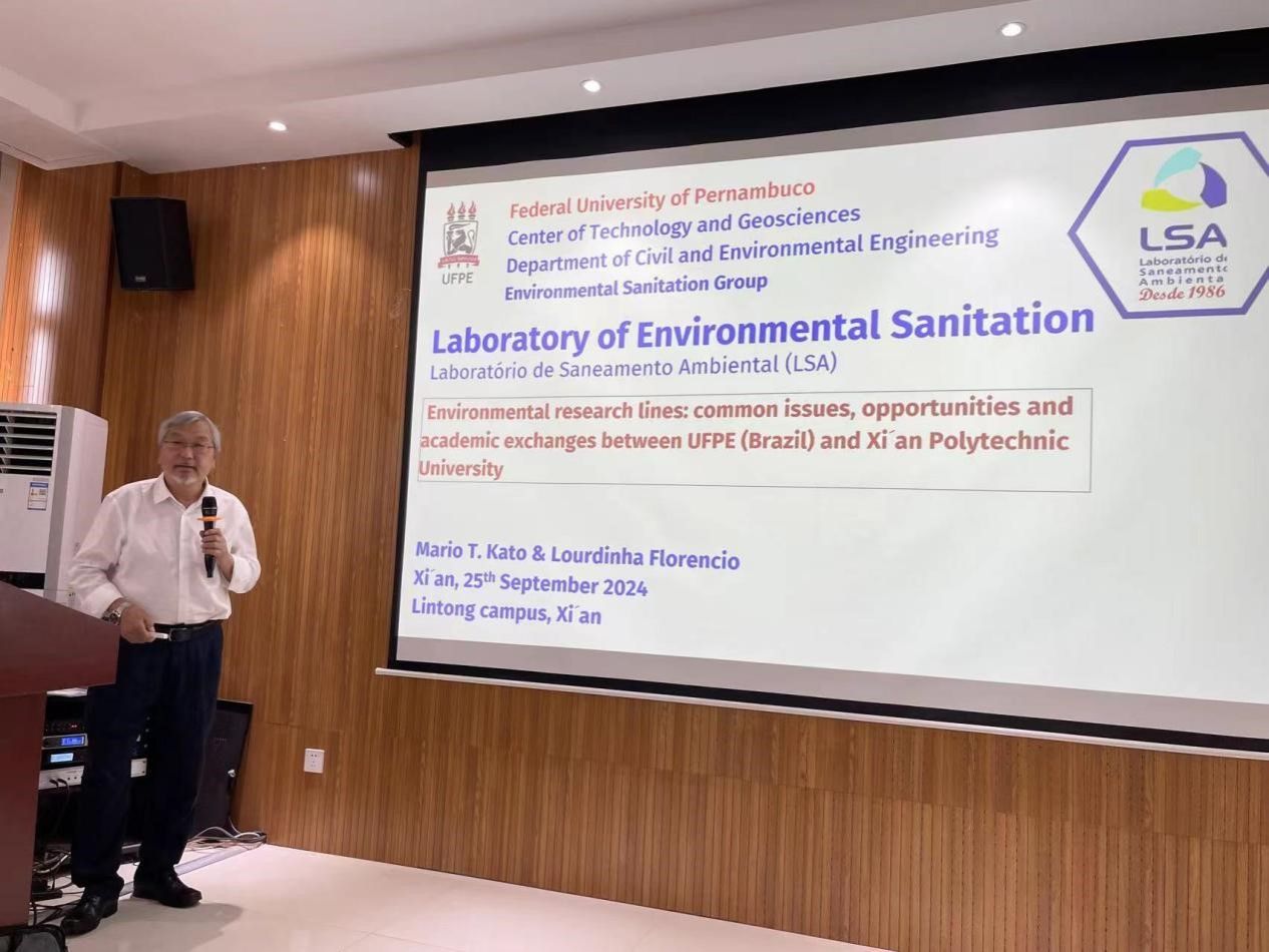 Mario教授以“Environmental research lines: common issues, opportunities and acdemic exchanges between UFPE (Brazil) and XPU (环境研究方向:巴西巴南布哥联邦大学与西安工程大学的共同议题、机遇与学术交流) ”为题,展开了一场别开生面的学术盛宴。他从巴南布哥累西腓市的优美环境、特色饮食、悠久传统等轻松话题切入,引领众人仿佛身临其境领略巴西的异国风情。之后,他详细介绍了所负责的环境卫生实验室(LSA)和生物废水处理、回用和水质研究课题组的研究方向,并针对环保水处理的机遇与前景进行了深入分享,为学院师生带来了前沿的学术观点和宝贵的研究经验。与会师生反响热烈,纷纷积极提问。