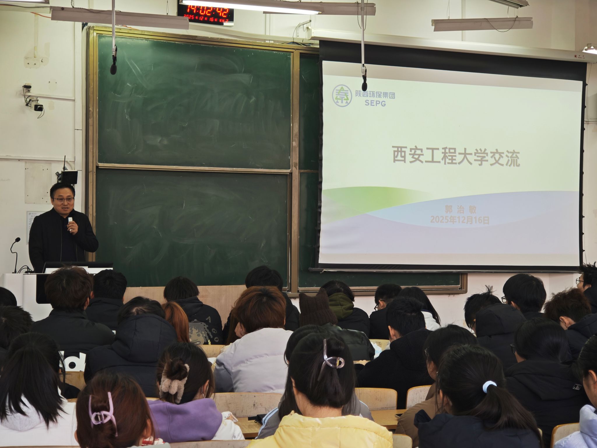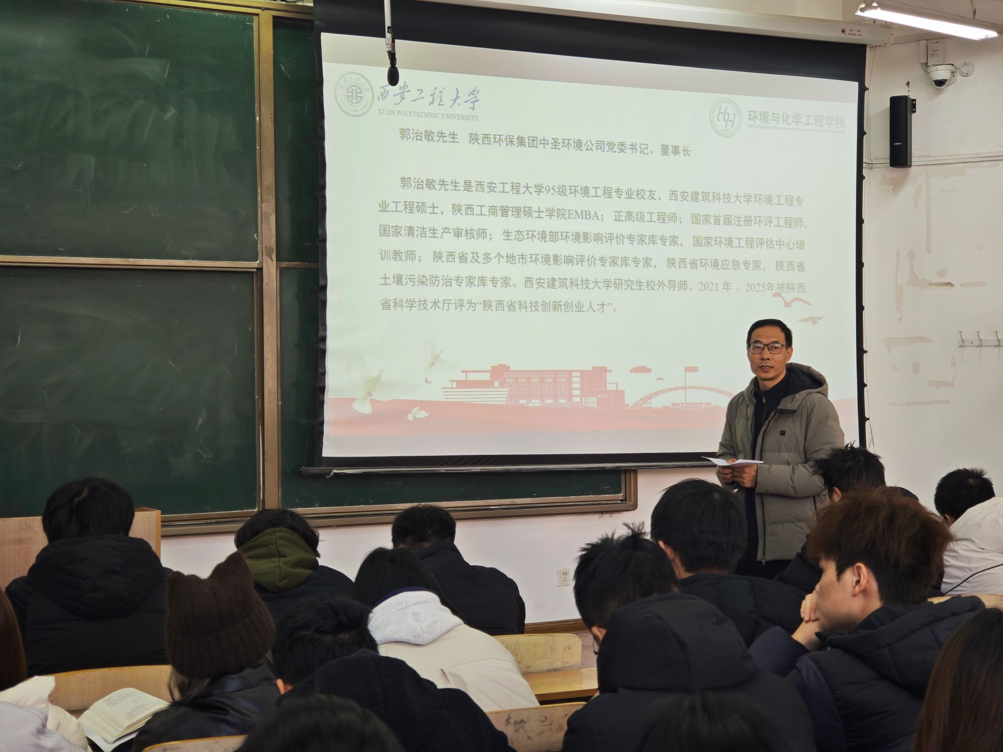 12月16日,925足球网 第十九期“绿风·环化论坛”于临潼校区教学楼B135教室圆满举行。本次论坛特邀陕西环保集团中圣环境公司党委书记、董事长、我校95级环境工程专业校友郭治敏先生重返母校,以“人生·专业·未来”为主题,为2025级环境工程专业学生带来了一场内涵深刻、视野开阔的专题报告。学院党委副书记林定武、2025级辅导员吕国正出席活动,报告会由环境科学与工程系副主任王理明主持。
