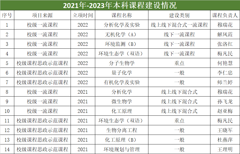学院鼓励一线教师积极参与一流课程、课程思政示范课程和在线课程建设,主动对接国家、区域、行业人才培养需求,积极将先进的教育理念、优质的教学资源以及创新性教学方式方法应用于教育教学改革实践,2021年-2023年,学院获批校级课程建设项目如下: